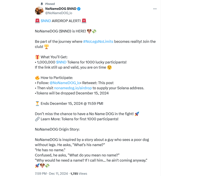 NoNameDOG (NND) embodies the spirit of an underdog with an unstoppable movement. Even without legs, it will bite into DOGE’s dominance leaving the old champ stunned and bleeding.